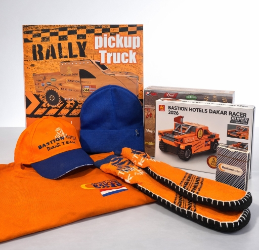 - Het merchandise pakket bestaat uit een Bastion Hotels Dakar Team muts, een door Maik Willems gesigneerde Dakar pet, Bastion Hotels Dakar Team shirt, Bastion Hotels Dakar Team sokken, Bastion Hotels Dakar Team puzzel, Bastion Hotels Dakar Team lego auto, Bastion Hotels Dakar Team kartonnen auto en een Bastion Hotels speelkaarten set.