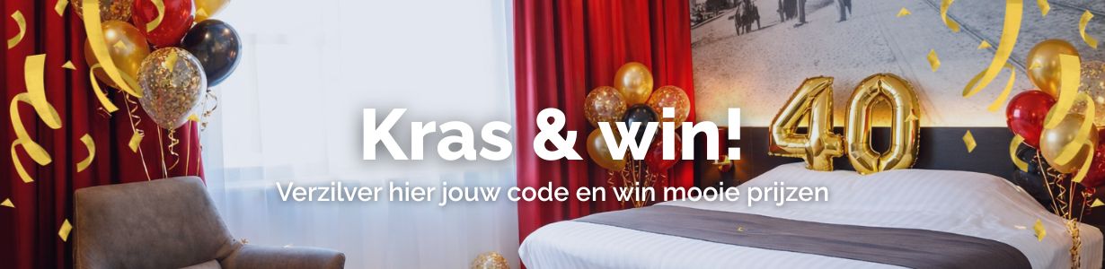 Ter ere van ons 40-jarig jubileum delen we cadeautjes uit. Met jouw kraskaart maak je naast vele andere prijzen ook kans op een van de drie hoofdprijzen. Voer je code in, ontdek wat je hebt gewonnen en wie weet ga jij er met één van onze hoofdprijzen vandoor.