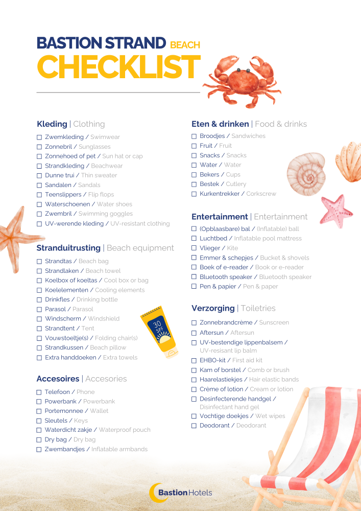 Zo, jij bent er helemaal klaar voor! Met al deze tips, hacks en slimme voorbereidingen ben je écht klaar voor een heerlijk, zorgeloos dagje strand. Hieronder vind je een snelle checklist zodat je echt niets vergeet naar het strand.